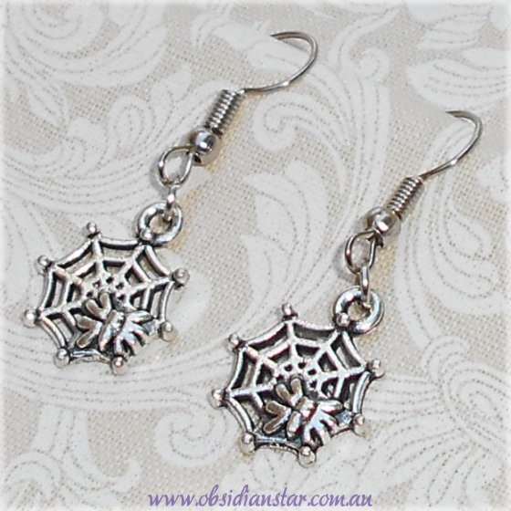 These earrings feature a cobweb with mini spider.