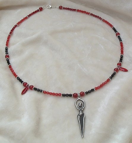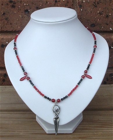 This necklace features a lead-free pewter woman pendant. Made from a mixture of red and black Czech fire-polished glass beads, Czech glass teardrop beads, with metal spacer beads.