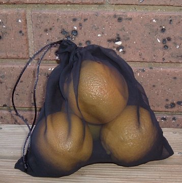They are approx 25cm X 25cm, which will hold about a kilo (around 6 oranges). Chiffon, with nylon drawstring.